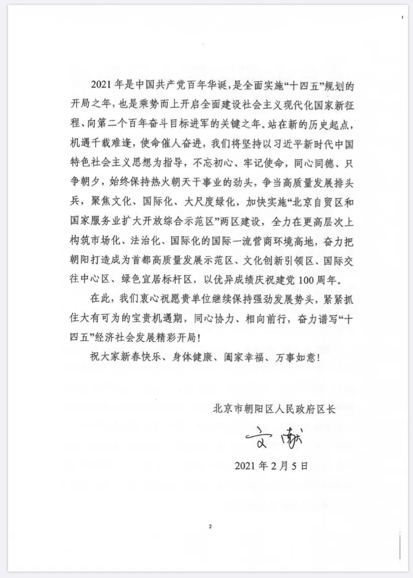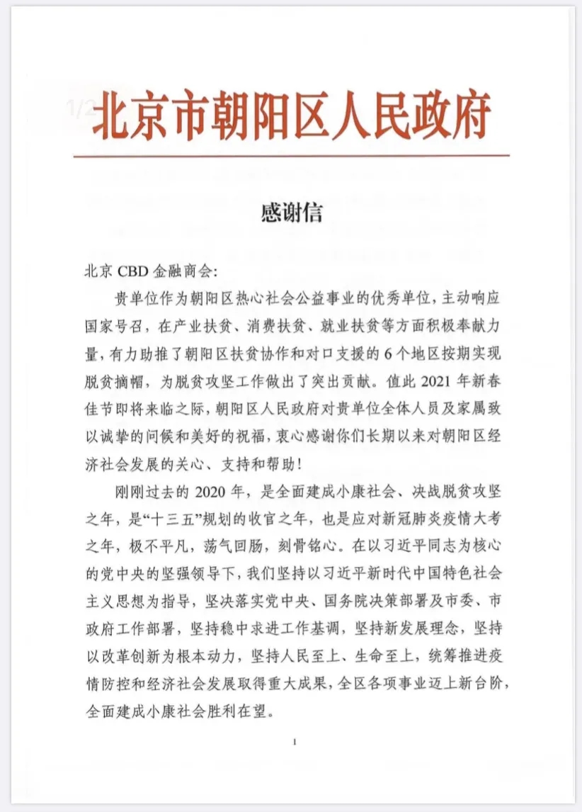刚刚过去的2020年,北京CBD金融商会在区金融办的领导下,结合行业专业优势,整合各方资源,在打赢疫情防控阻击战、脱贫攻坚战、参与社会治理、支持企业复工复产、服务区域金融机构及促进经济发展等方面发挥了积极作用,彰显了融金朝阳魅力,释放了社会温暖,新春佳节即将到来之际,朝阳区人民政府特对北京CBD金融商会全体成员送上诚挚的问候和美好的祝福,这既是对商会工作的肯定,也是对我们的鼓励和激励,新的一年,让我们继续携手为推动区域金融领域发展及经济发展助力,持续传递朝阳温度。