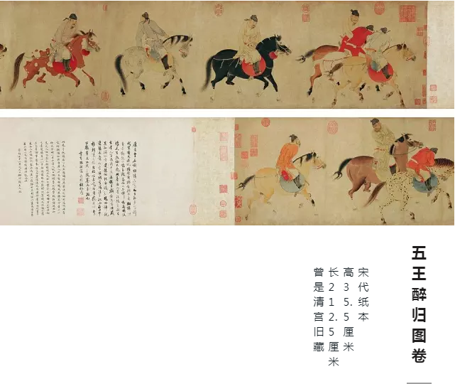 这幅《五王醉归图卷》曾在1911年辛亥革命推翻了满清政府被溥仪以赐溥杰的名义私带出紫禁城,几经辗转,被带到伪满州国存于吉林小白楼,1945年满洲国覆灭,从小白楼再散出民间的这批清宫旧藏书画,被称为“东北货”。